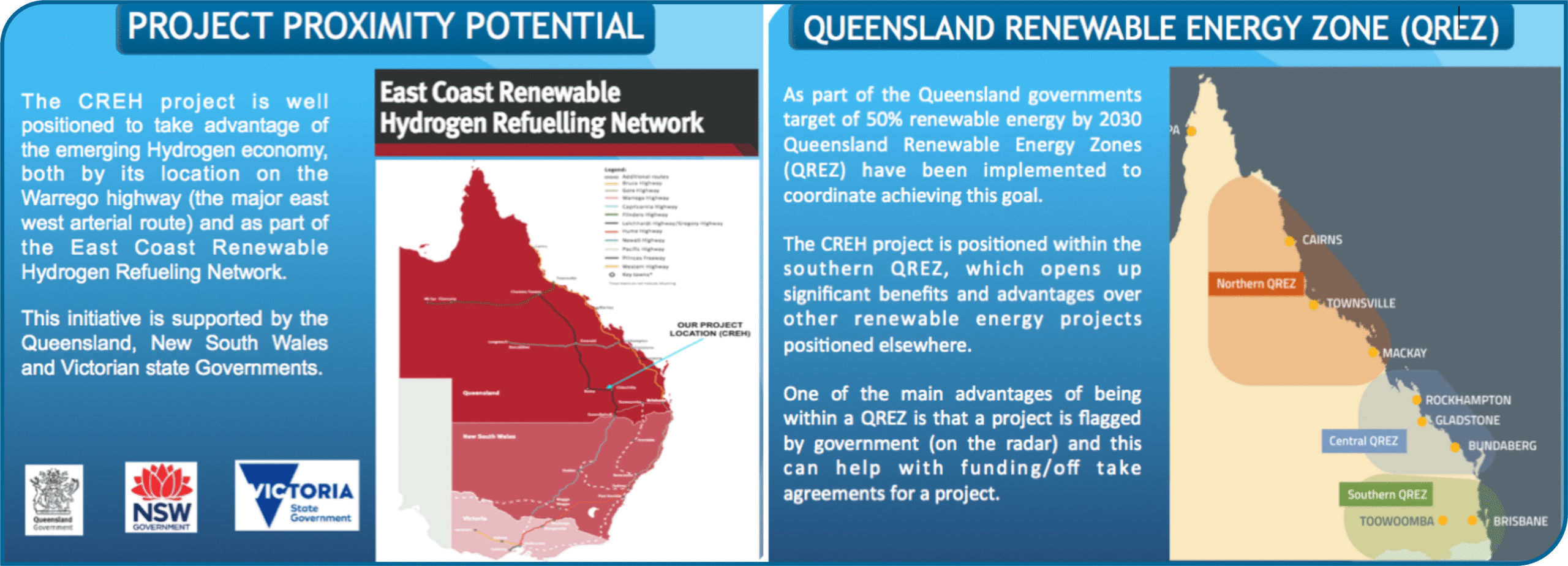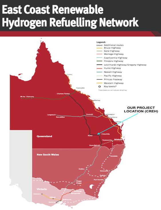 The CREH project is well positioned to take advantage of the emerging Hydrogen economy, both by its location on the Warrego highway (the major east west arterial route) and as part of the East Coast Renewable Hydrogen Refueling Network. This initiative is supported by the Queensland, New South Wales and Victorian state Governments.